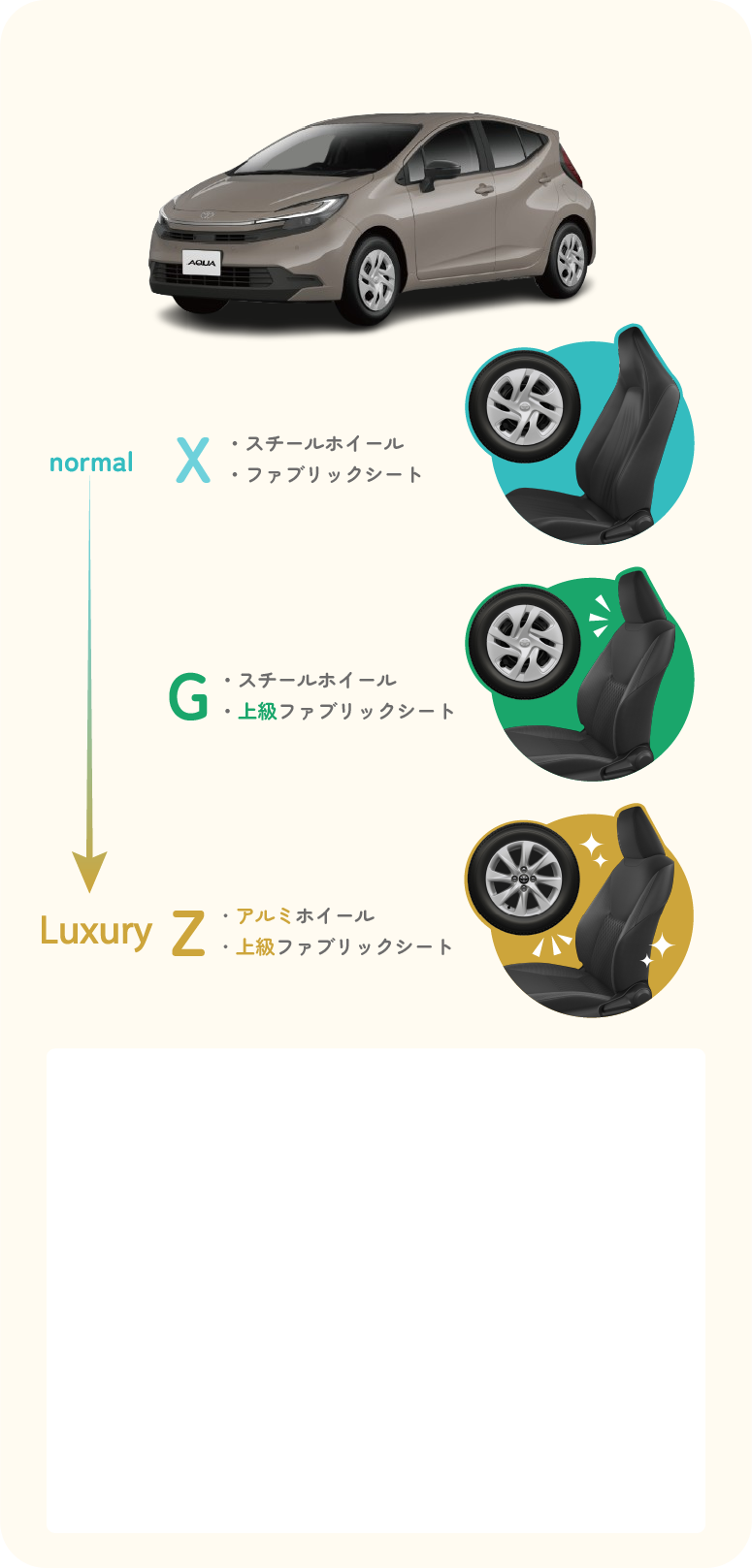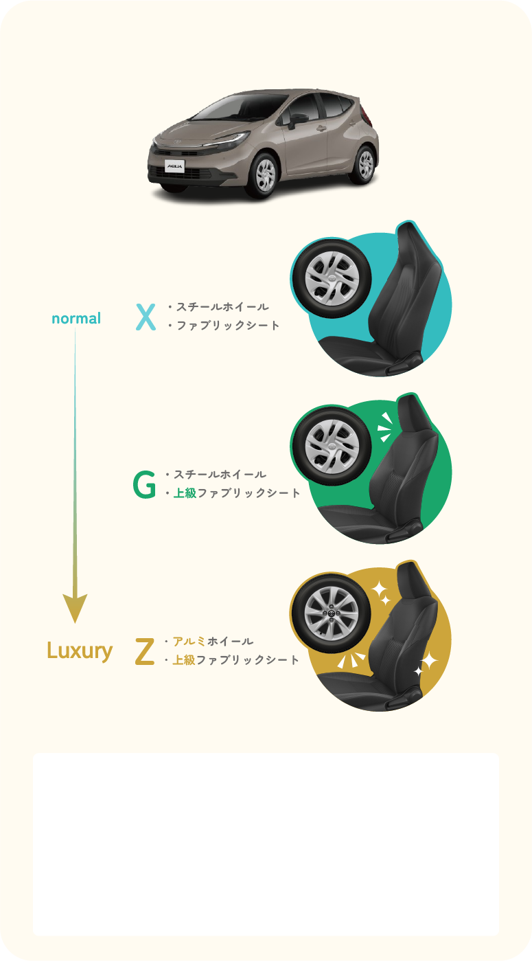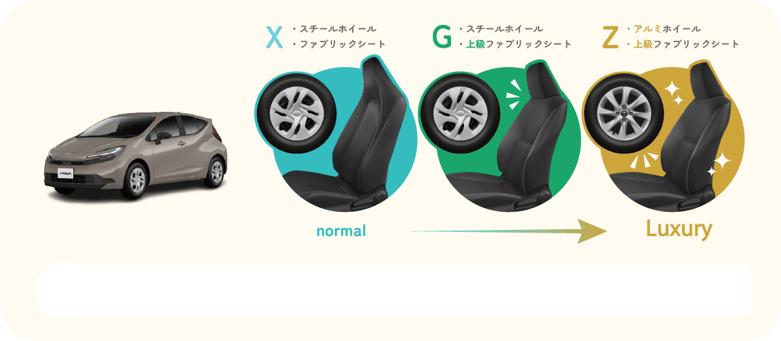 同じ車でも、タイヤホイールの種類や内装の質感、安全機能の充実度によってグレードが分かれています。