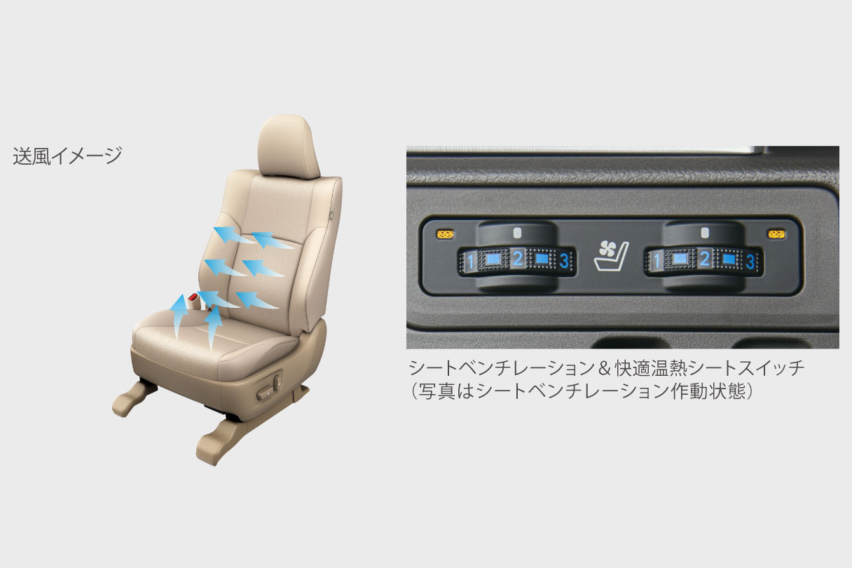 フロントシートの背もたれと座面から爽やかな風が吹き出るシートベンチレーション機能を搭載。夏の暑い日にも、シートと密着している背中や足腰の蒸れを防ぎます。